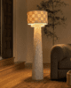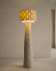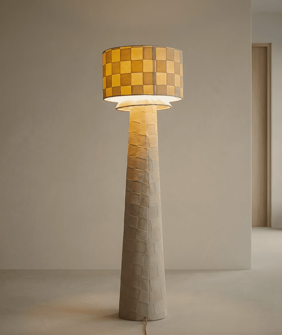 Inspired by woven rug craftsmanship, the Loomspire Floor Lamp becomes a striking vertical sculpture. Its tall, tapered form with a subtle woven texture is balanced by a cylindrical shade, while a warm glow enhances its surface—blending textile tradition with contemporary design.